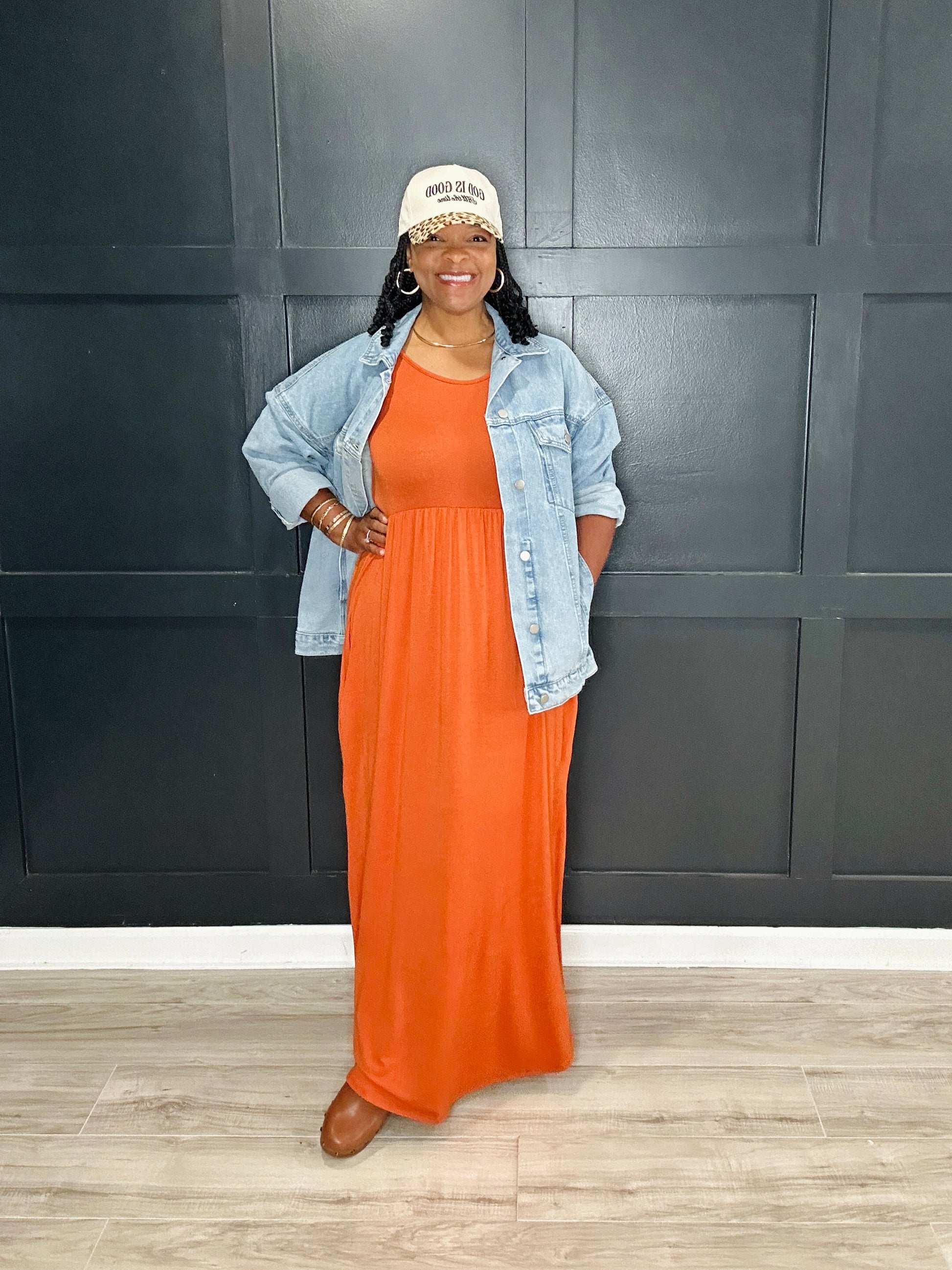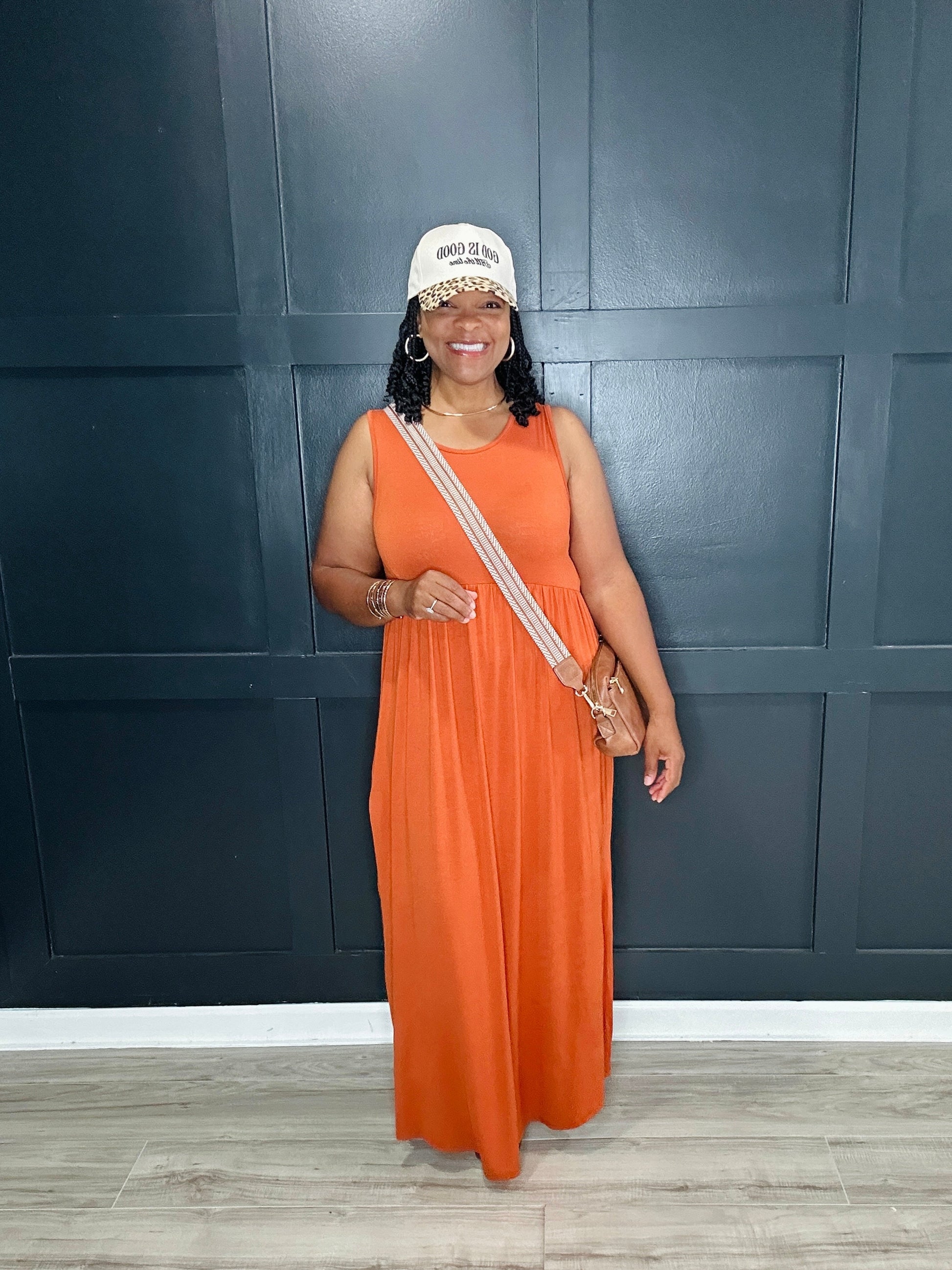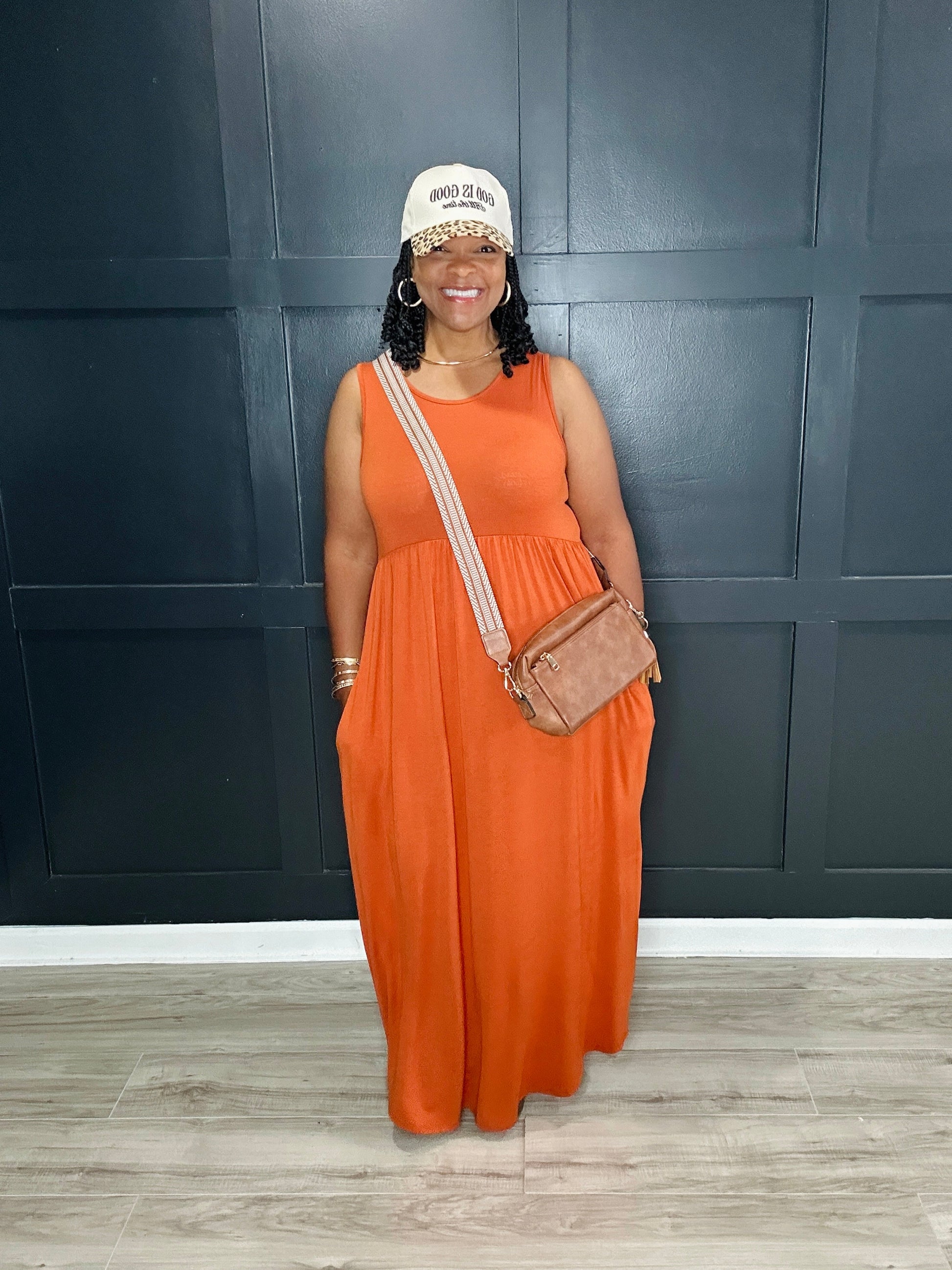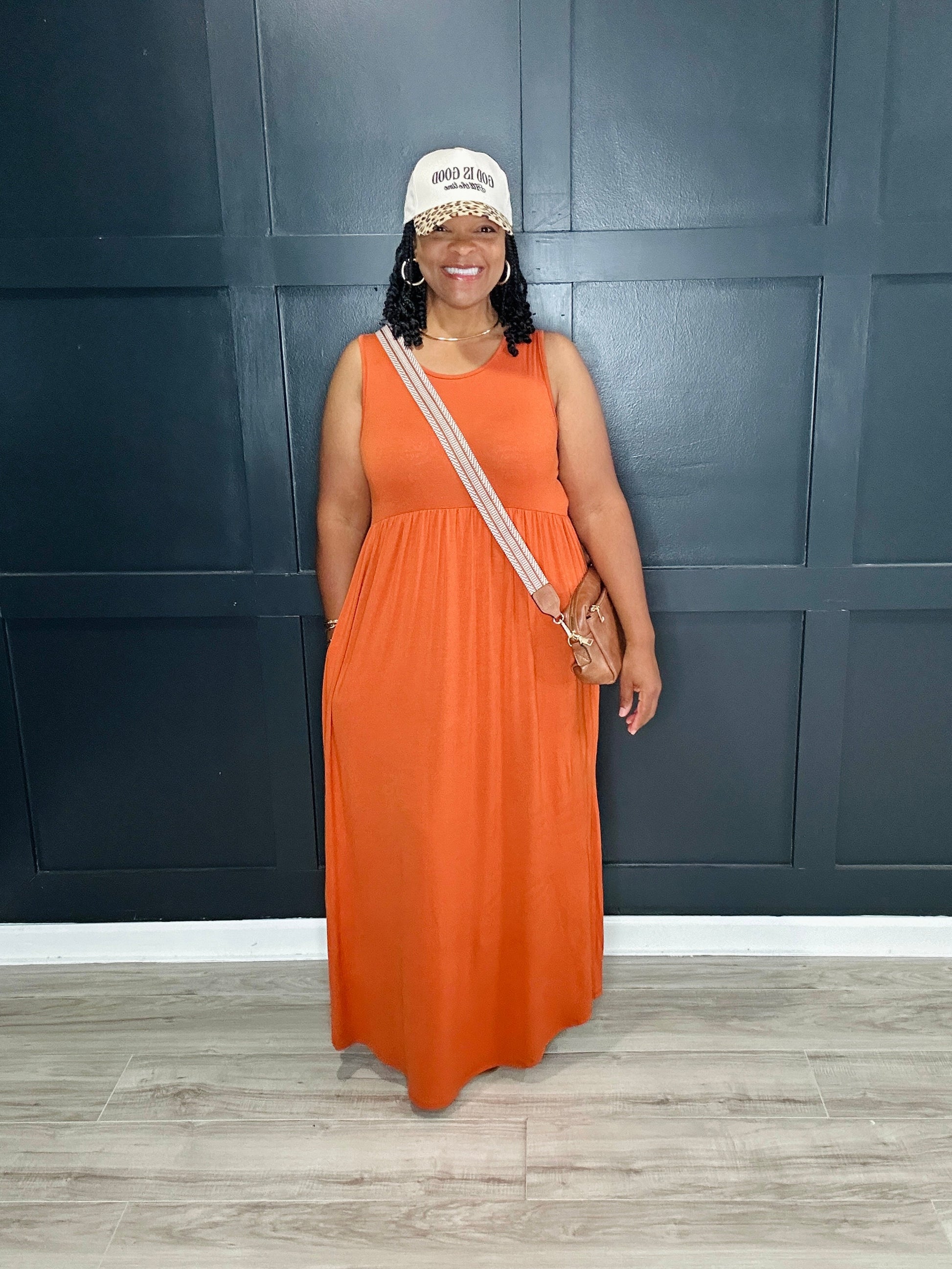Perfect for fall, this sleeveless maxi dress features a flowy fit and a shirred waist, complete with pockets and a length that's perfect for taller women. It's a versatile option for any occasion, whether you choose to layer it with a jacket or cardigan for work, church, or casual everyday wear.
